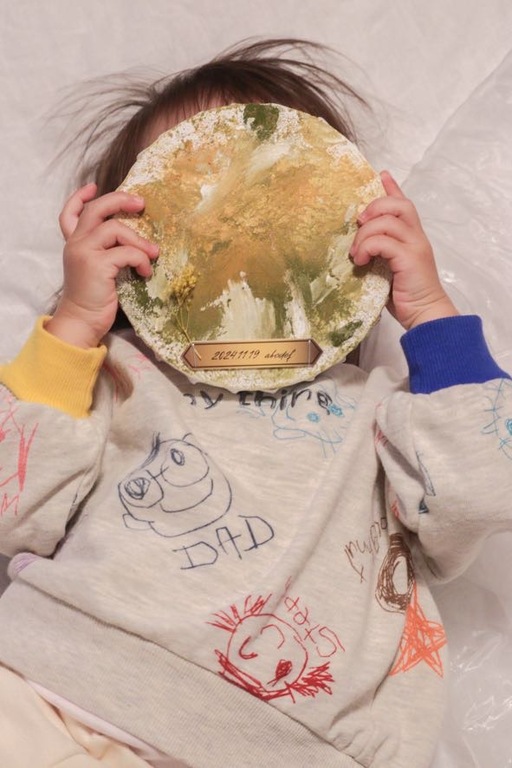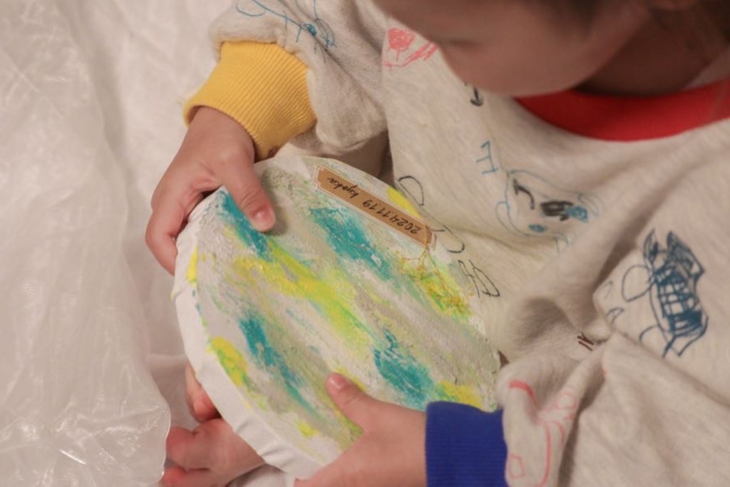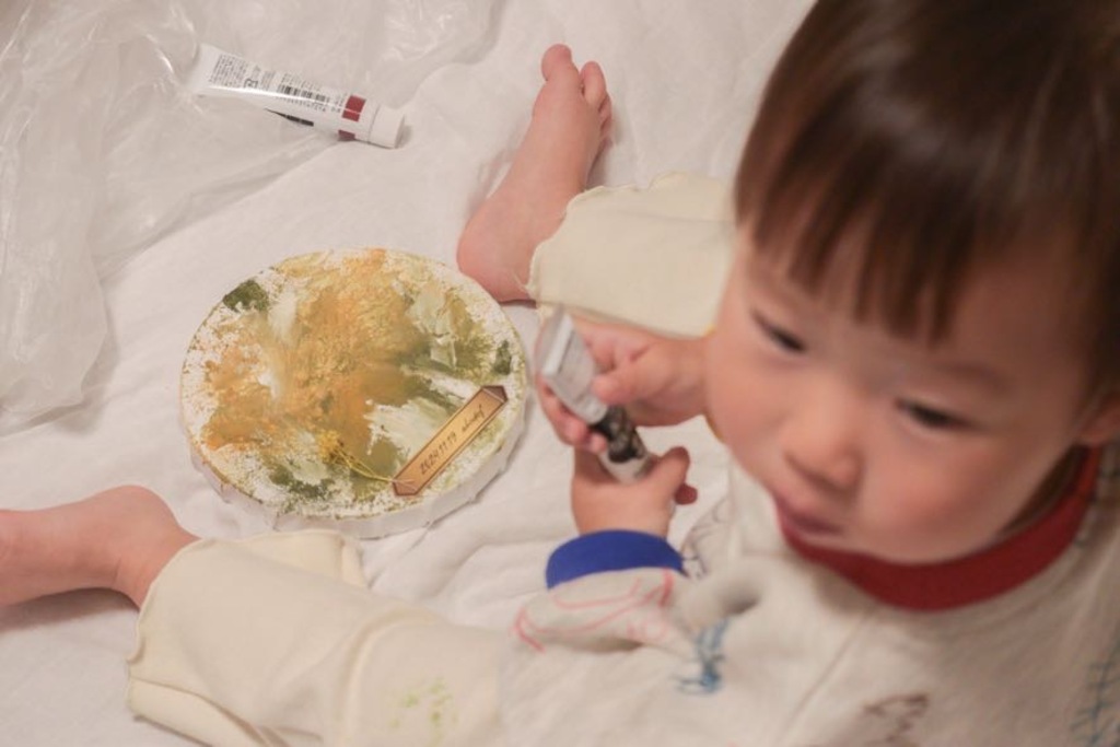 ファーストアートとは子どもが生まれて初めて描くアート作品のことです。好きな絵の具を選んで自由に描いてもらいます。完成後はおしゃれなインテリアとしてお家に飾ることも可能です。