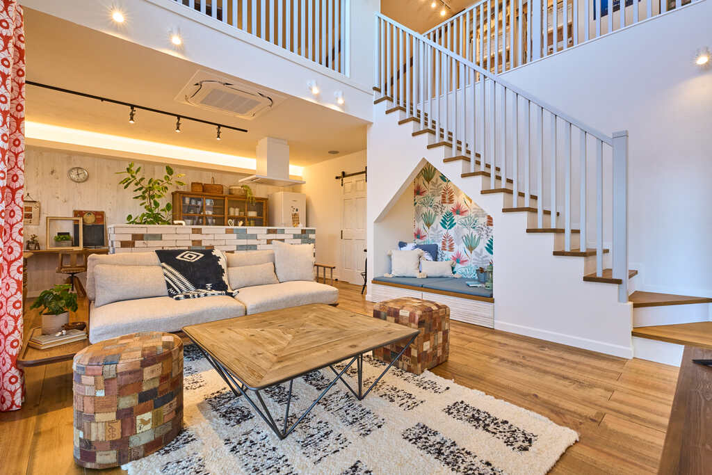 階段下の空間を有効活用した、ドアなどで区切らずにゆるやかに家族とつながるのヌック。ちょっと座って家族と話すベンチとして使ったり、読書をするための書斎として使ったり、子どもの遊び場にしたりと、フレキシブルに使うことができます。