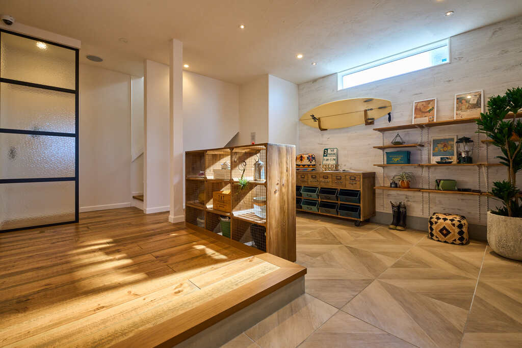 靴だけでなく、大型のキャンプ道具やベビーカー、サーフボード、ゴルフバッグのようなスポーツ用品などをしっかり収納できる玄関の土間収納。こだわって選んだアイテムだから、収納していても、ばえるように土間収納も床材や壁材にもこだわりをプラス。