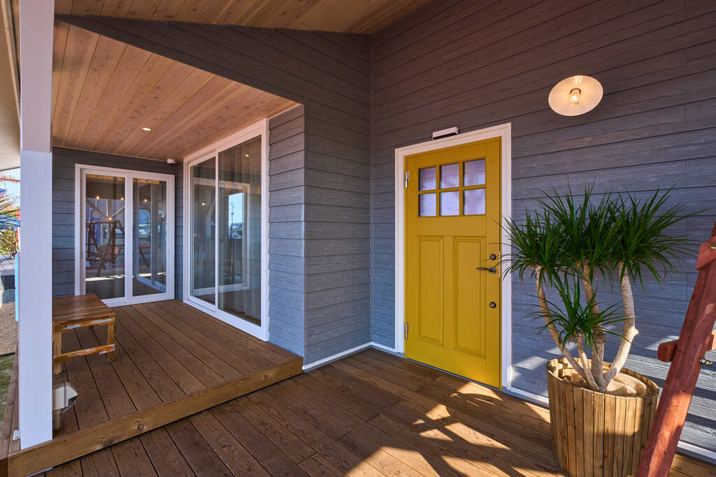 TKU御代志住宅展示場は、開放感のあるカリフォルニアスタイルのモデルハウスです。ブルーグレーのラップサイディングとカバードポーチ、イエローの玄関ドアが特徴的。アクティブライフを楽しめる工夫もたくさん。