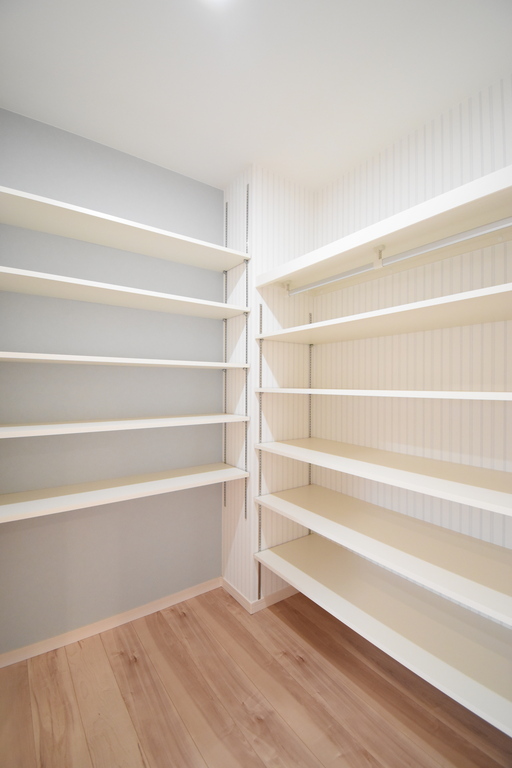 洋服だけでなく、キャリーケースや季節物の家電も収納できる寝室のウォークインクローゼット。物をまとめて収納することで、部屋がすっきりと片付きます。