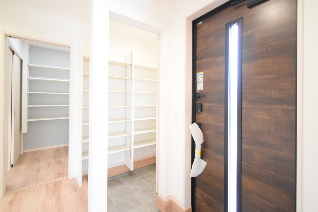 扉付きのシューズクロークに、家族の靴をまとめて収納。玄関がすっきり片付くので急な来客時も安心です。靴だけでなく外で使用するベビーカーや傘なども収納できるのも魅力。