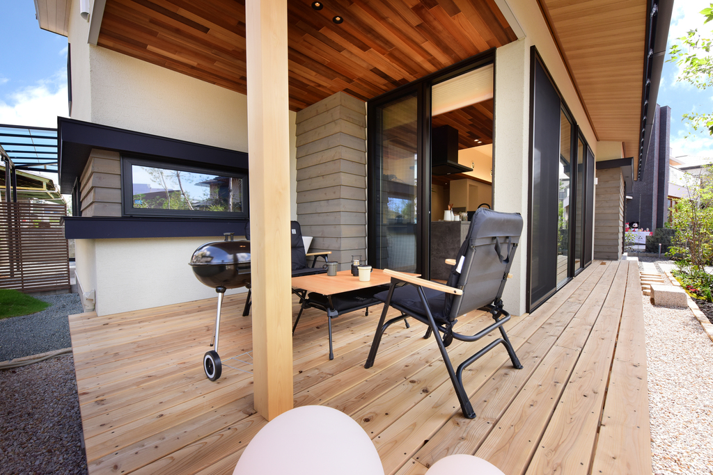 リビングからつながるウッドデッキは、広さと開放感を実現。家族や友人とBBQを楽しんだり、夏にはビニールプールを置いて子どもと一緒に遊ぶ場所としても◎。夜は星空の下、夫婦でお酒を楽しむ場所にもぴったりです。