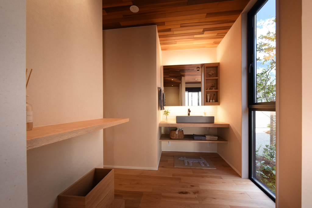 シューズクロークに靴を片付けたら、そのまま手洗い・うがいへ。花粉やウイルスを部屋に持ち込まないよう工夫された動線です。朝の忙しい時間にも活躍します。