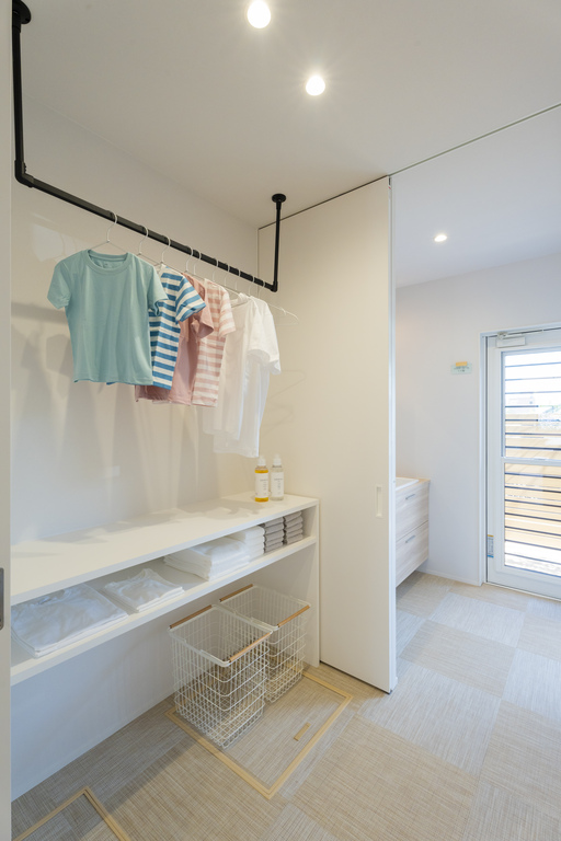 ランドリールームの隣にウォークインクローゼットを設け、洗濯から収納までをスムーズに行える動線にしました。