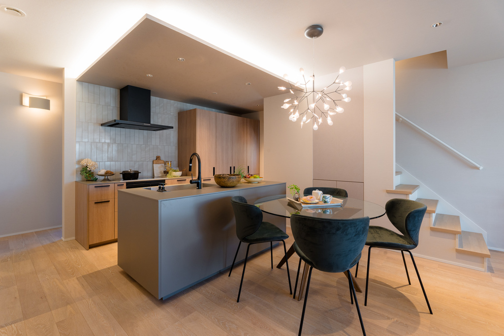 将来を見据えた1階完結の住まいに、間接照明が映える上質なキッチンと家事効率を高める動線を凝縮し、ホテルライクな美しさと心地よさを両立しました。