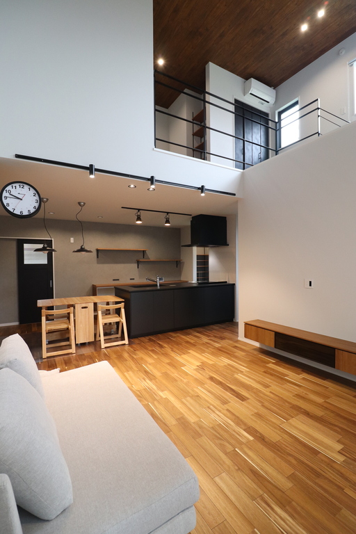 吹き抜けがリビングをさらに広く感じさせ、上下階でやさしく声が届くことで、家族のつながりを育む開放的な空間に。