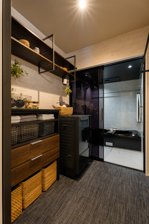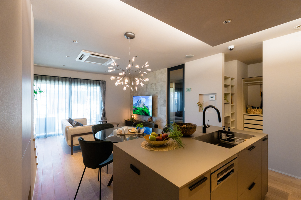 ホテルのようにスッキリとした空間づくりのために、収納スペースの取り方・見せ方にもこだわりました。ファミリーコンテナは、お子さまがリビングで広げたおもちゃやさっと取り出したい小物等をリビングの奥の死角に配置。そのほかにも、冷蔵庫が見えない工夫や見えてもオシャレなカップボード等アイデア満載です。