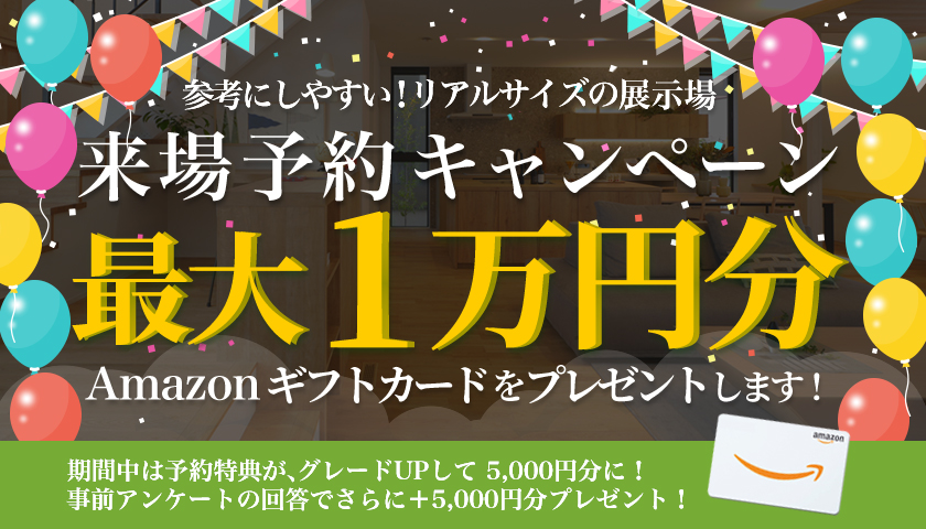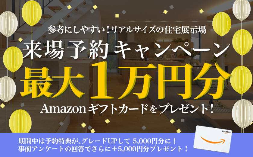 展示場の来場予約は今がおすすめ!初回限定の来場特典としてAmazonギフトカード5,000円分進呈!さらに予約後、簡単なアンケートに回答するとプラス5,000円分もらえる!