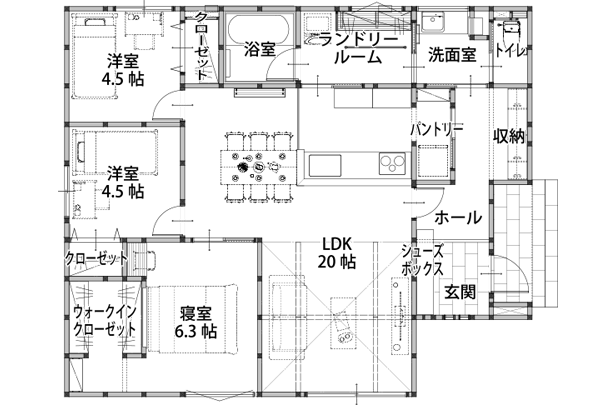平屋は快適。でも、洗濯や片付けで家の中を行き来することが多くなりがち。このモデルハウスでは、水まわりと収納を近くに配置し、移動に追われない、ゆとりある毎日を叶えました。